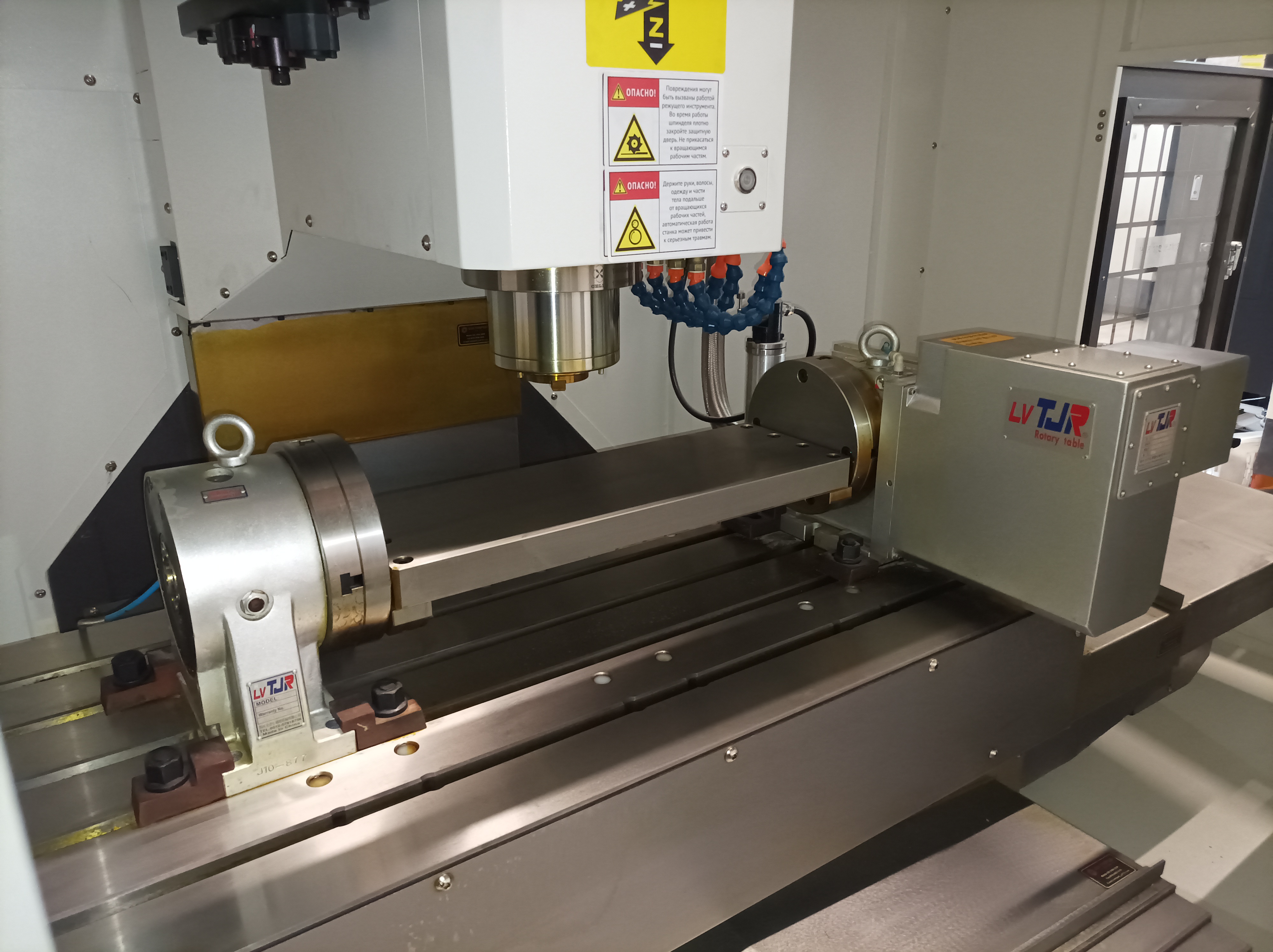 Четвертая ось (комплект поворотного стола TJR AR-210R-К с поворотной задней опорой RTA-210, Тайвань) (доп опция) L-блоки и установочная плита обеспечивают надежное крепление стола и опоры к рабочему столу станка. Подключение осуществляется к системе ЧПУ станка (Fanuc, Siemens, Heidenhain, отечественные системы).