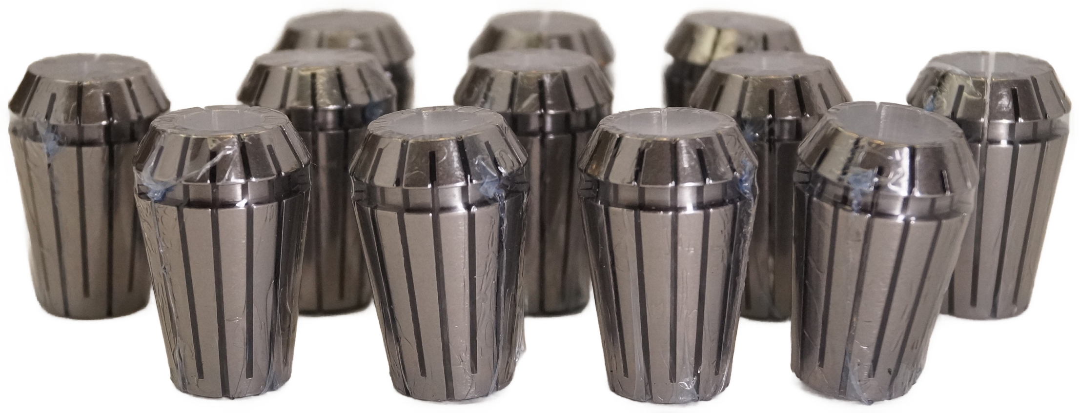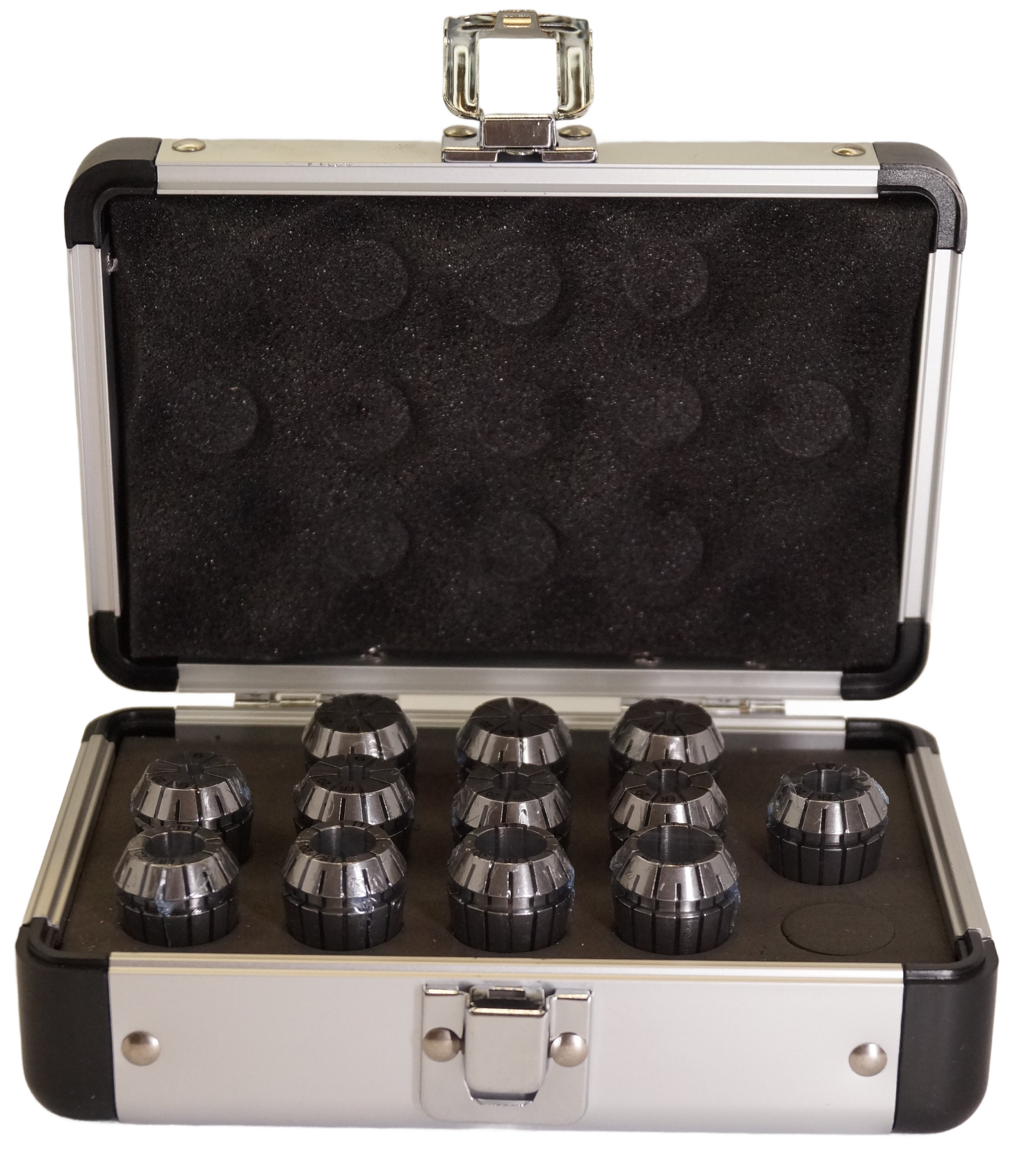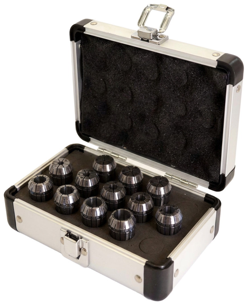 2. Набор из 12 цанг позволяет закрыть практически все потребности по закреплению концевого инструмента (фрез, сверл, метчиков) с хвостовиками от 2 до 13 мм.
