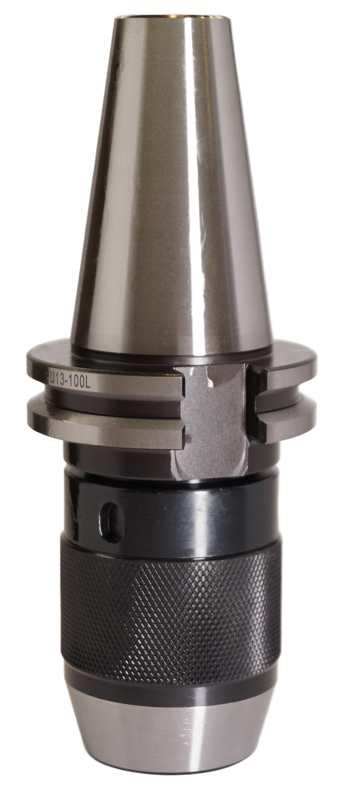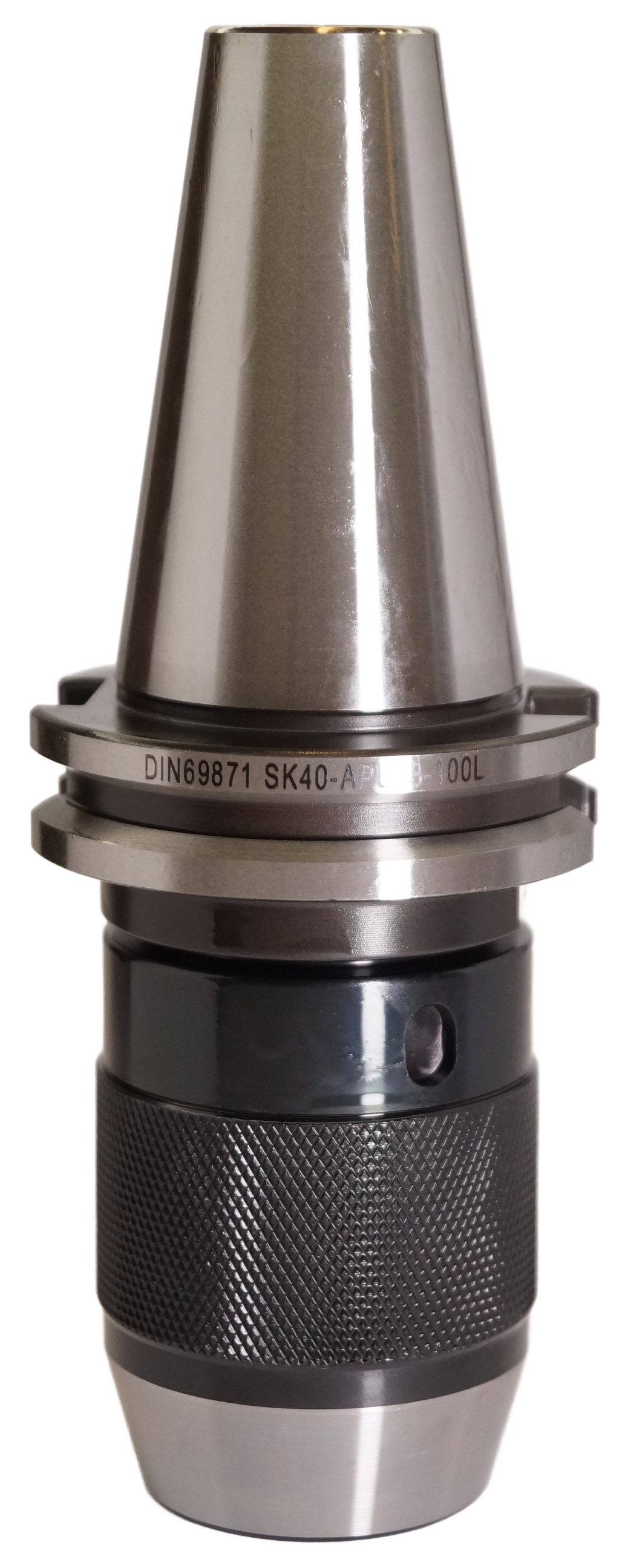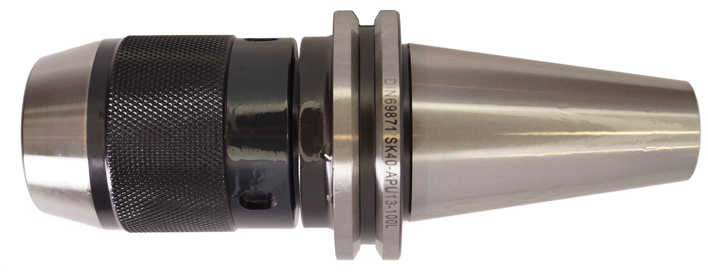 Сверлильный патрон SK40-APU13-100 для закрепления инструментов с цилиндрическим хвостовиком, конус SK DIN69871. Вылет от шпинделя 100 мм, биение в пределах 0,1 мм. Диапазон зажима d 1-13 мм.